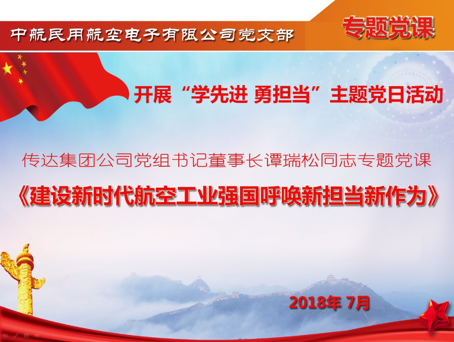 2018年7月11日,在紀念建黨97周年的日子里,中航民用航空電子有限公司黨支部組織全體黨員深入學習貫徹黨的十九大精神,深化落實上級黨委的部署,在黨支部開展"學先進 勇?lián)?quot;主題黨日活動。