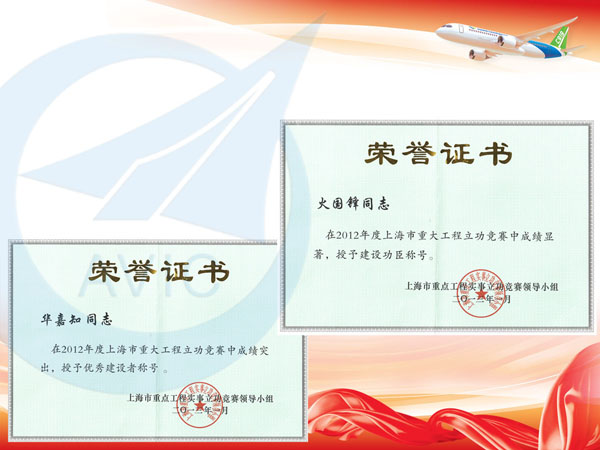 2013年1月,上海市重大工程立功競賽先進個人稱號花落中航民用航空電子產業(yè)園建設項目。公司副總經理火國鋒榮獲2012年度上海市重大工程立功競賽建設功臣稱號;規(guī)劃建設部部長華嘉知榮獲2012年度上海市重大工程立功競賽優(yōu)秀建設者稱號。